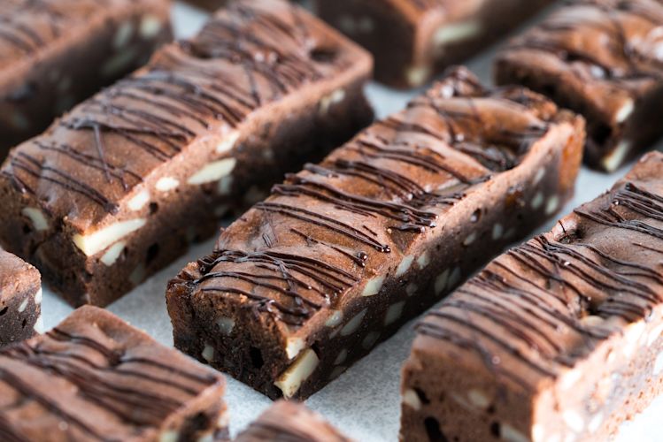 1. Cream butter with sugar and glucose syrup. 2. Slowly incoporate eggs until homogenous. 3. Sift all the dry powders. 4. Fold into the creamed egg and butter mixture, mix until homogenous. 5. Fold in the toasted almonds and dried strawberries. 6. Shape into a rectangle, 1.5cm in height. 7. Bake at 170C for 12 minutes. 8. Drizzle melted cocoa mass over the protein bars to garnish. 9. Cool and slice.