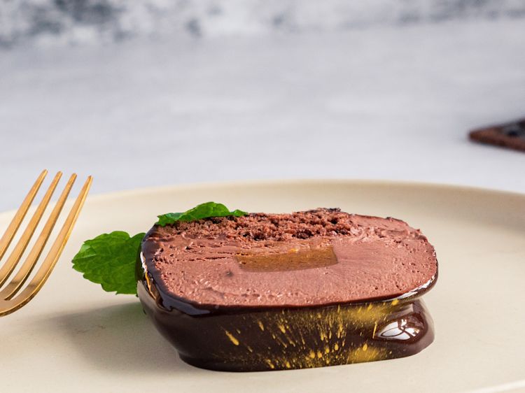 - Add cut genoise to the top of the feuilletine. Pressing down slightly (it is ok if some of the mousse comes up from the sides).