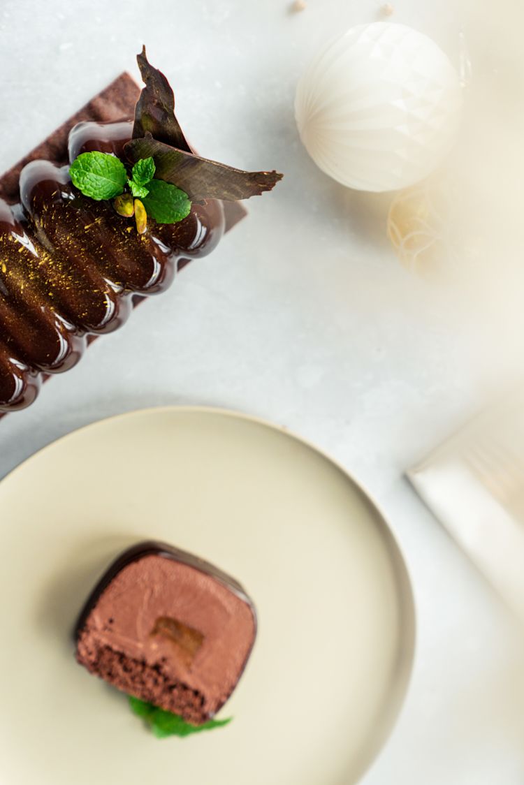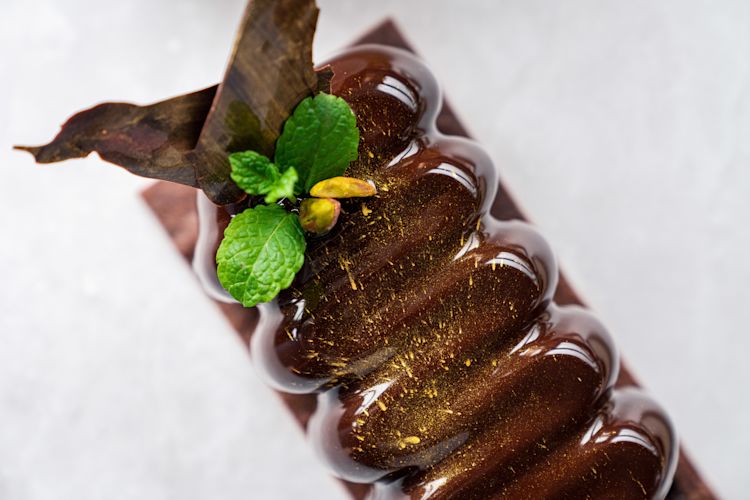 - Transfer glazed buche onto cocoa sable, cleaning the side with the palette knife.