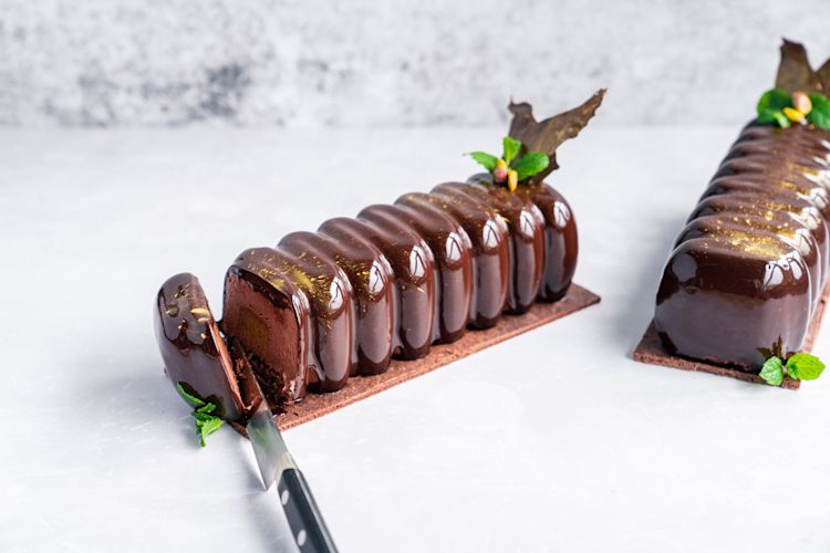 - Pour glaze over buche. Tap sheet tray on table very lightly to help glaze drip evenly.