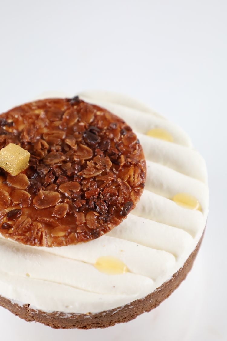- Pipe a small dollop of the whipped oat cream on the left side. Place a disc of the oat nib nougatine on top and press down to secure.